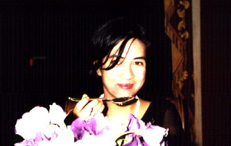 Doesn't my Salsa partner look lovely, framed by those flowers whose name we know not?